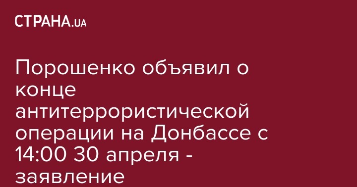"С сегодняшнего дня, 30 апреля, 2018 года, антитеррористическая операция широкомасштабная на территории Донецкой и Луганской областей завершается. Мы сейчас начинаем военную операцию под руководством Вооруженных сил Украины для обеспечения защиты территориальной целостности, суверенитета и независимости нашего государства… АТО закончилось, противостояние агрессии, отпор российскому агрессору завершится тогда, когда будет освобожден последний лоскуток украинской земли, при чем как на территории Донецкой и Луганской областей, так и на территории оккупированного Крыма", - сказал верховный главнокомандующий в понедельник за заседании военного руководства страны, которое транслировали украинские телеканалы.
