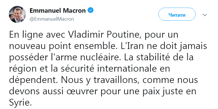 "Телефонный разговор с Владимиром Путиным, для нового обсуждения положения дел. Иран никогда не должен обладать ядерным оружием. От этого зависят стабильность региона и международная безопасность. Мы работаем над этим, как мы должны поработать и для справедливого мира в Сирии", - написал французский президент.