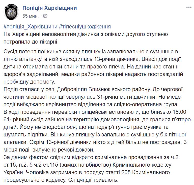 В Харьковской области житель села Доброволье (Близнюковский район) бросил бутылку с зажигательной смесью в беседку, где находилась 13-летняя девочка. Об этом сообщает отдел коммуникаций ГУ Нацполиции в Харьковской области в Facebook.