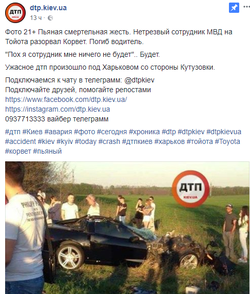 "Фото 21+ Пьяная смертельная жесть. Нетрезвый сотрудник МВД на Тойота разорвал Корвет. Погиб водитель", - говорится в сообщении ресурса dtp.kiev.ua в Facebook.
