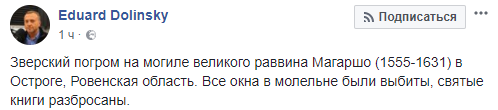 "Зверский погром на могиле великого раввина Магаршо (1555-1631) в Остроге, Ровенская область. Все окна в молельне были выбиты, святые книги разбросаны", - написал он.