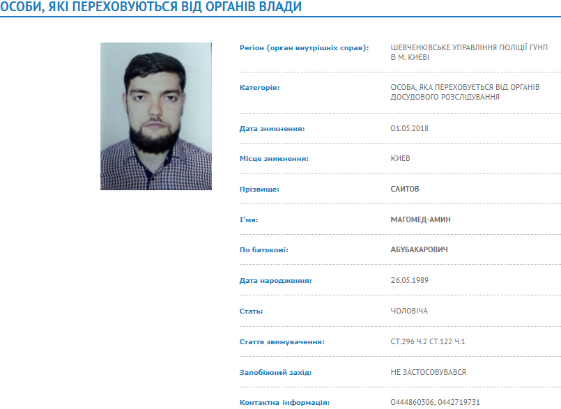 На сайте отмечается, что Саитов с 1 мая скрывается от органов предварительного расследования и разыскивается Шевченковским районным управлением полиции Киева.