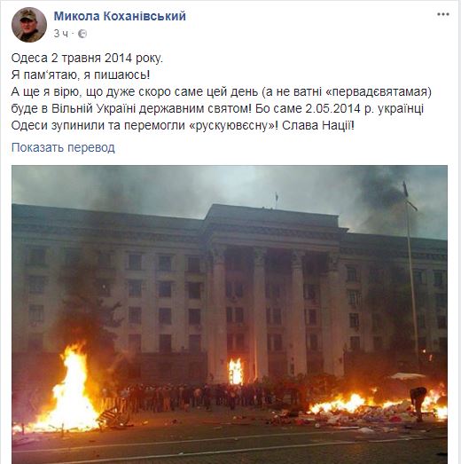 Глава ОУН Михаил Коханивский призвал сделать 2 мая государственным праздником. И то ли специально, то ли невольно написал в Facebook "я помню, я горжусь" - лозунг 9 мая в России.