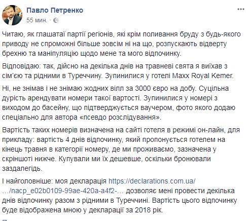 Министр утверждает, что его декларация позволяет ему провести несколько дней отдыха вместе с родными в Турции. Он считает, что информацию об его отдыхе распространяют "глашатаи Партии регионов".