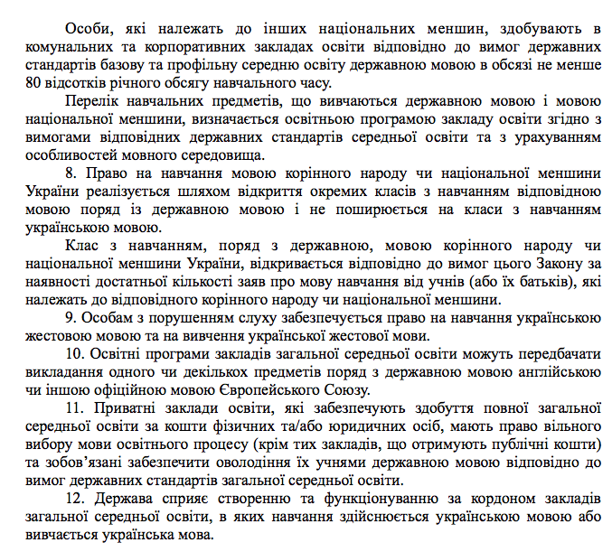 Так, например, русским, белорусам и крымским татарам, которые составляют основные национальные меньшинства страны количественно, предлагается свободно учиться на своем языке только в начальной школе – там им гарантируется от 90% до 80% обучения на русском или крымско-татарском.