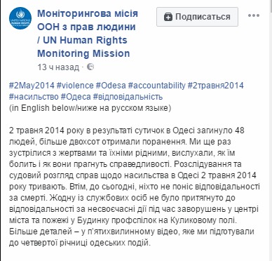 "2 мая 2014 года в результате столкновений в Одессе погибли 48 человек, более двухсот были ранены. Мы вновь встретились с жертвами и их семьями, выслушали их боль и желание справедливости. Расследования и судебное рассмотрение дел о насилии в Одессе 2 мая 2014 года продолжаются. До сегодняшнего дня никто не понес ответственности за смерть людей. Никто из должностных лиц не привлечен к ответственности за несвоевременные действия по время беспорядков в центре города и пожара в Доме профсоюзов на Куликовом поле. Больше деталей - в пятиминутном видео, которое мы подготовили к четвертой годовщине одесских событий", - говорится в сообщении Миссии ООН.