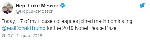 Президента Соединенных Штатов Америки Дональда Трампа официально номинировали на Нобелевскую премию мира. Письмо в комитет премии отправил конгрессмен Люк Мессер, об этом он написал в Тwitter.