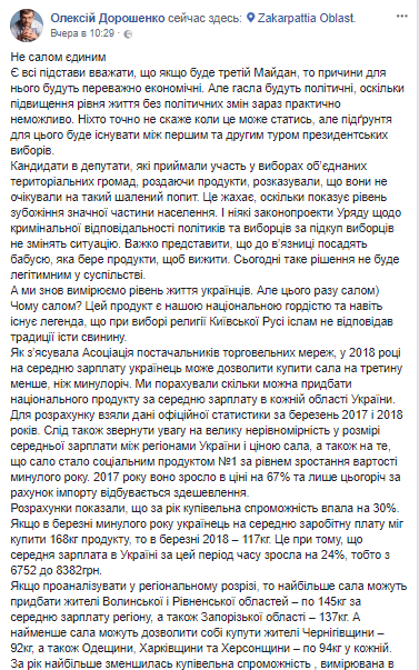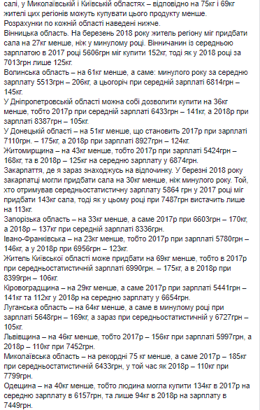 "Мы посчитали, сколько можно купить сала за среднюю зарплату в каждой области Украины. Для расчета взяли данные официальной статистики за март 2017 и 2018 годов. Следует обратить внимание на неравномерность средних зарплат и цен на сало, а также на то, что сало стало лидером подорожания в прошлом году. Так, в 2017 году цена его повысилась на 67%. В этом году за счет импорта происходит удешевление", - пишет он.