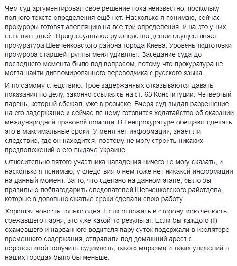 При этом он также выразил удивление относительно того, что одним и тем же фигурантам в одном и том же деле выбрали разную меру пресечения, учитывая, что степень их участия в правонарушении не установлена. Нардеп также напомнил, что при этом прокуроры и следователи требовали для всех троих фигурантов правонарушения содержание под стражей.