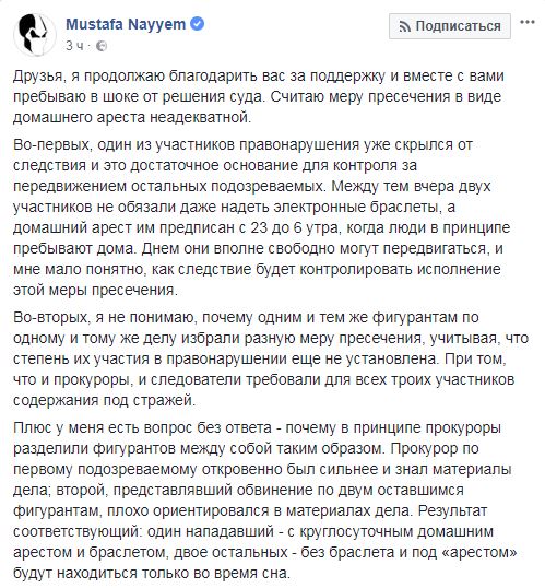 "Друзья, я продолжаю благодарить вас за поддержку и вместе с вами нахожусь в шоке от решения суда. Считаю неадекватной меру пресечения в виде домашнего ареста", - написал Найем.