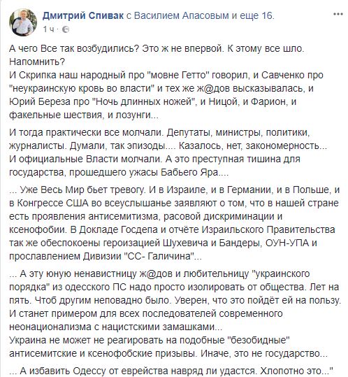 Политик, общественный деятель Дмитрий Спивак считает, что происходящее вполне объяснимо: "А чего все так возбудились? Это ж не впервой. К этому все шло. Напомнить? И Скрипка наш народный про "мовне гетто" говорил, и Савченко про "неукраинскую кровь во власти" и тех же ж@дов высказывалась, и Юрий Береза про "Ночь длинных ножей", и Ницой, и Фарион, и факельные шествия, и лозунги...