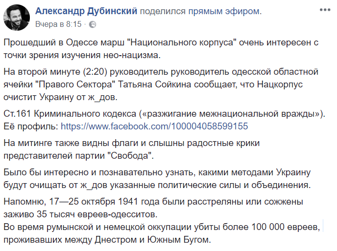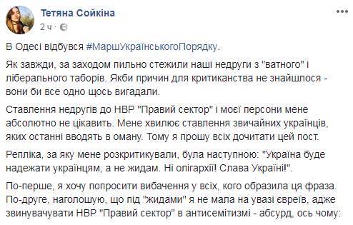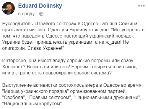 "Мы уверены в том, что наведем в Одессе настоящий украинский порядок. Украина будет принадлежать украинцам, а не ж*дам! Не олигархии. Слава Украине!"