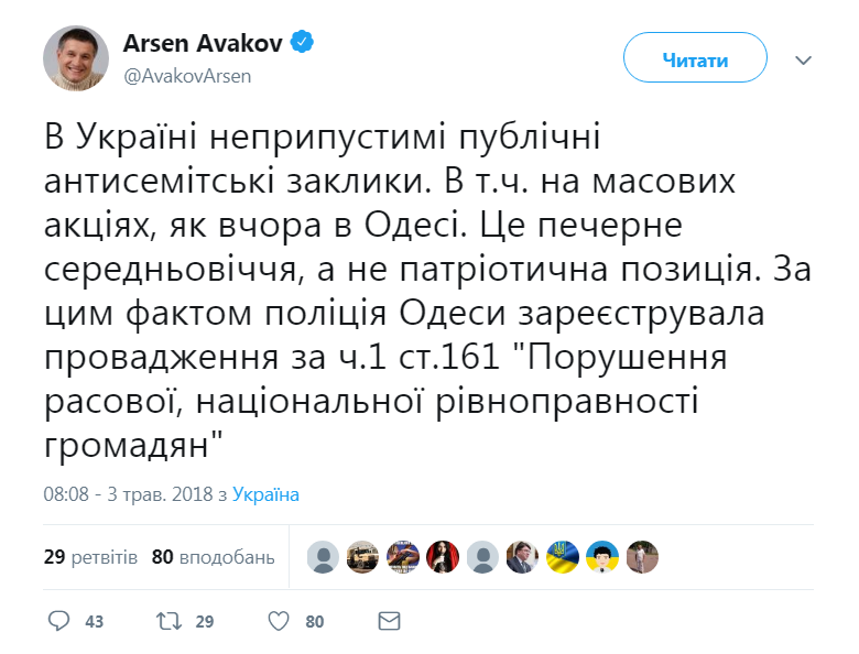 "В Украине недопустимы публичные антисемитские призывы. В том числе на массовых акциях, как вчера в Одессе. Это пещерное средневековье, а не патриотическая позиция", – отметил министр.