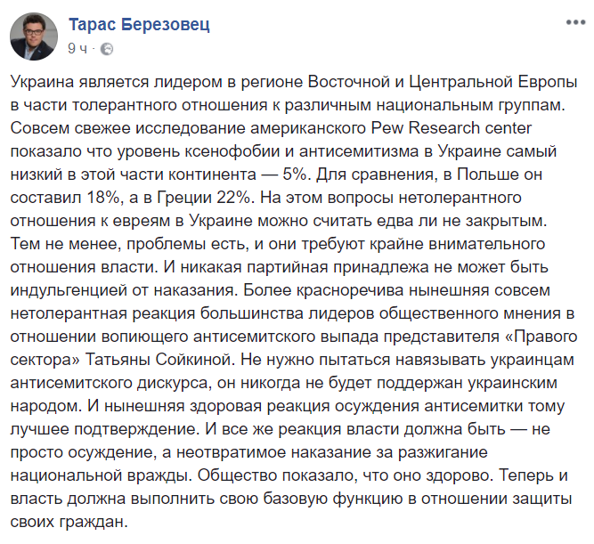 При этом Березовец раскритиковал Сойкину, заявив, что "никакая партийная принадлежность не может быть индульгенцией от наказания". И призвал власть отреагировать на заявления "антисемитки".