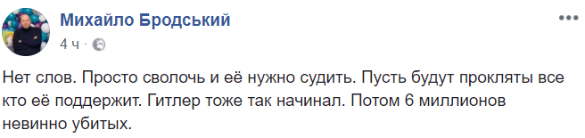 "Нет слов. Просто сволочь и ее нужно судить. Пусть будут прокляты все, кто ее поддержит. Гитлер тоже так начинал. Потом 6 миллионов невинно убитых", – пишет бизнесмен Михаил Бродский.