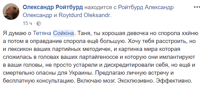 "Я думаю о Тетяна Сойкіна. Таня, ты хорошая девочка но спорола х...ню, а потом в оправдание спорола ещё большую. Хочу тебя расстроить, но и лексикон ваших партийных методичек, и картинка мира которая сложилась в головах ваших партайгеноссе и которую они имлантируют в ваши головы, не просто устарели и дискредитировали себя, но ещё и смертельно опасны для Украины. Предлагаю личную встречу и бесплатную консультацию. Включаю мозг. Эксклюзивно. Эффективно", – написал он.