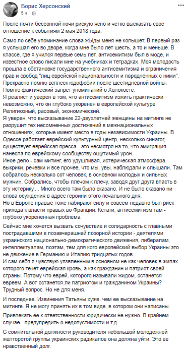 Я уверен, что высказывание 22-летней женщины на митинге не разрушит тех несомненных достижений в межнациональных отношениях, которые имеют место в годы независимости Украины. В Одессе работает еврейский культурный центр, несколько синагог, существует еврейская пресса – это, несмотря на то, что эмиграция нанесла еврейскому сообществу ощутимый урон".