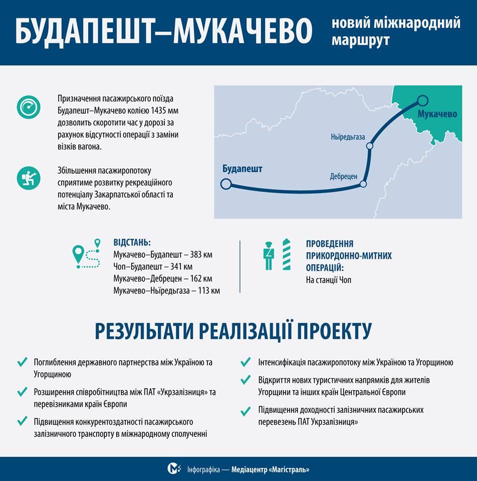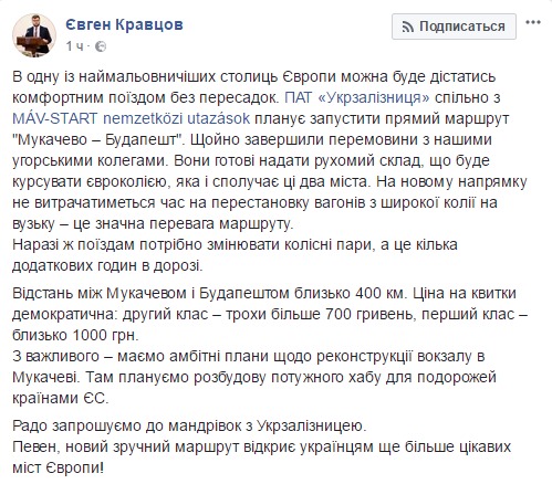 "В одну из самых живописных столиц Европы можно будет добраться на комфортном поезде без пересадок. ПАО "Укрзализныця" совместно с MÁV-START nemzetközi utazások планирует запустить прямой маршрут "Мукачево - Будапешт". Только что завершили переговоры с нашими венгерскими коллегами. Они готовы предоставить подвижной состав, который будет курсировать по евроколее, которая и соединяет эти два города", - написал Кравцов.