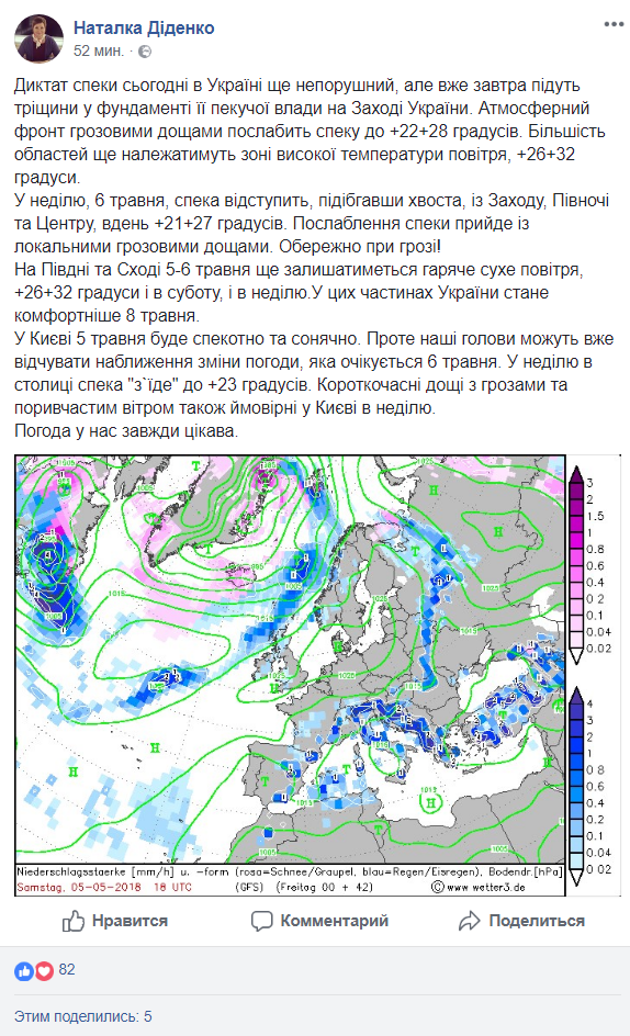 "В Киеве 5 мая будет жарко и солнечно. Однако наши головы могут уже чувствовать приближение изменения погоды, которое ожидается 6 мая. В воскресенье в столице жара "съедет" до +23 градусов. Кратковременные дожди с грозами и порывистым ветром также вероятны в Киеве в воскресенье", - добавила Диденко.