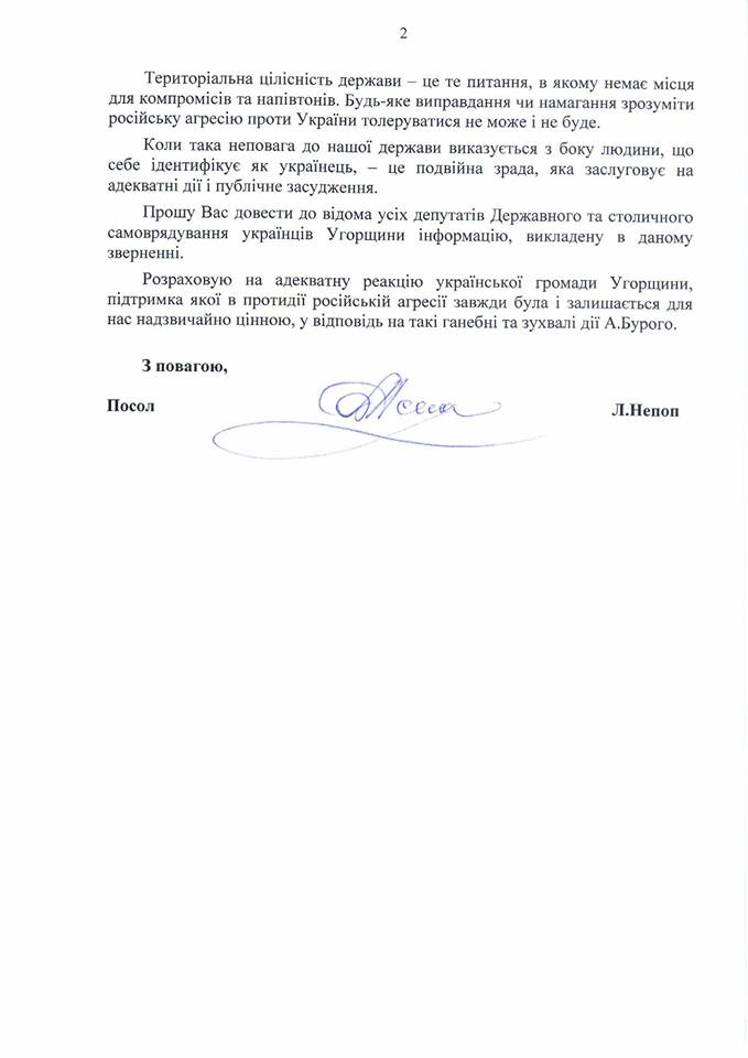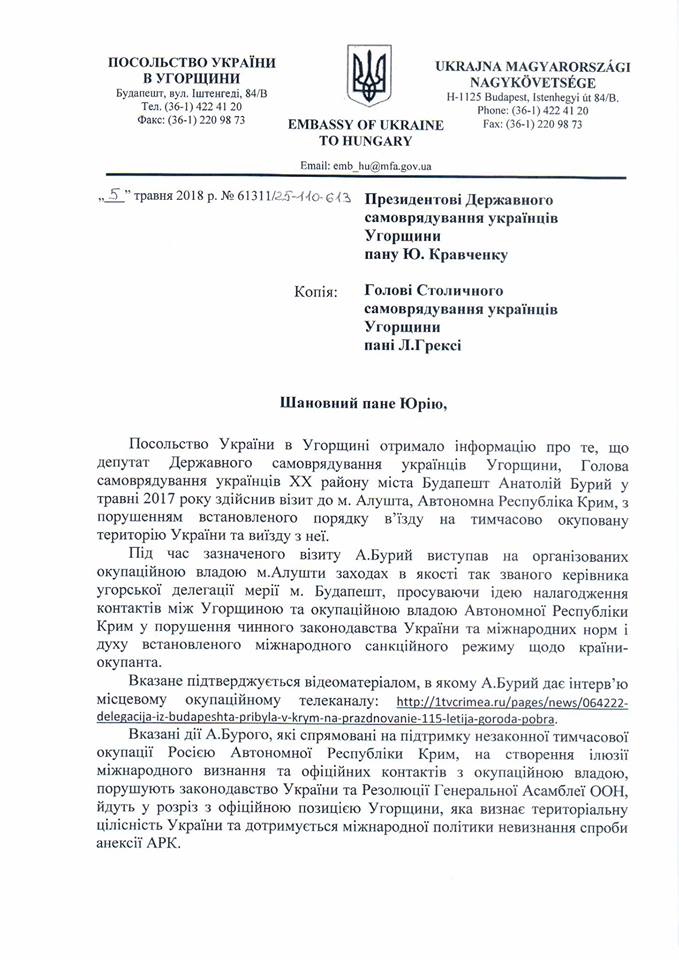 Непоп рассказал, что депутат Государственного самоуправления украинцев Венгрии, председатель самоуправления украинцев ХХ района Будапешта Анатолий Бурый в мае 2017 года ездил в Алушту, где продвигал идею налаживания контактов между Венгрией и властями Крыма и давал интервью местным СМИ.