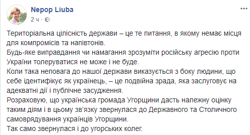 "Территориальная целостность государства - это тот вопрос, в котором нет места для компромиссов и полутонов. Когда такое неуважение к нашему государству выражается со стороны человека, который себя идентифицирует как украинец - это двойная измена, которая заслуживает адекватные действия и публичное осуждение", - подчеркнула посол.