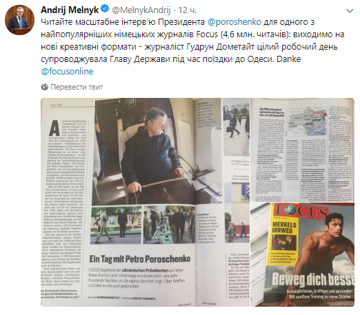 Об этом президент Украины рассказал в интервью немецкому издание Focus, сообщает посол Украины в Германии Андрей Мельник в своем Twitter.