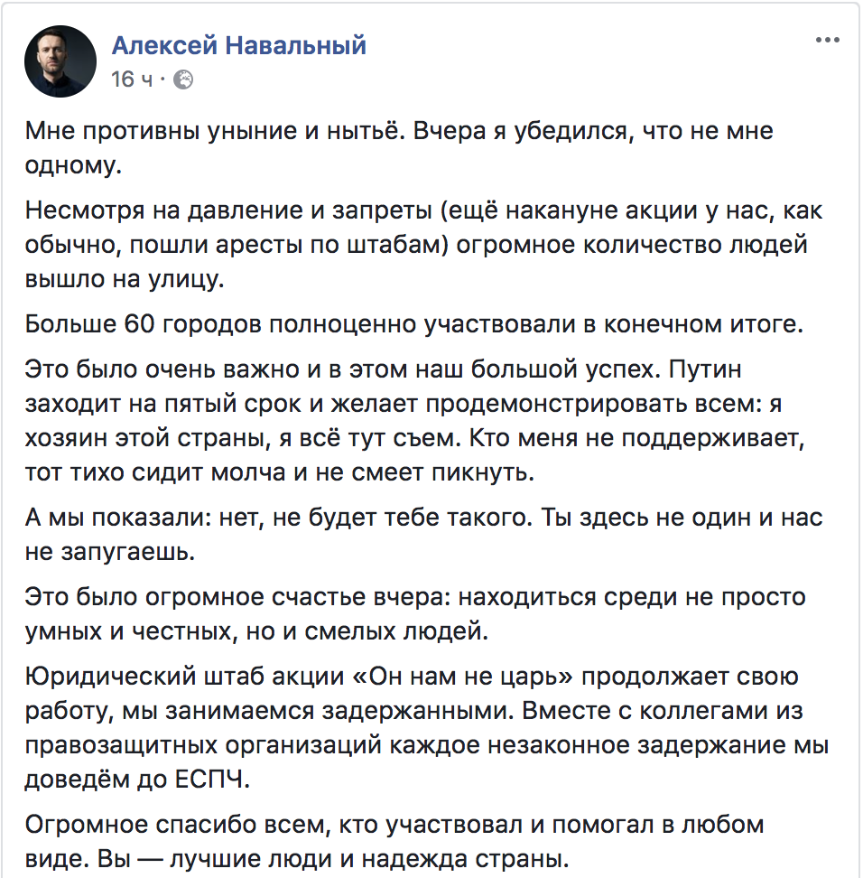 Юридический штаб акции "Он нам не царь" продолжает свою работу, мы занимаемся задержанными. Вместе с коллегами из правозащитных организаций каждое незаконное задержание мы доведём до ЕСПЧ", - написал Навальный у себя на ФБ.