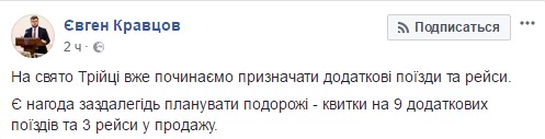 "Укрзализныця" назначила дополнительные поезда на Троицу. Об этом на своей странице в Facebook сообщил и.о. председателя правления компании Евгений Кравцов.