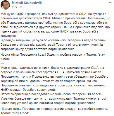 "Мои очень надежные источники, близкие к администрации США: на встрече с помощником госсекретаря США, Митчелл прямо сказал Порошенко, что либо Порошенко выполнит свои обещания по борьбе с коррупцией или он должен отказаться от второго срока. На что Порошенко ответил, что пойдет на второй срок и сказал, что именно НАБУ мешает борьбе с коррупцией.