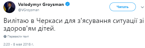 Премьер-министр Украины Владимир Гройсман срочно выехал в Черкассы в связи с массовым отравлением детей неизвестным веществом в средней школе №8. Об этом он написал в своем микроблоге Тtwitter.