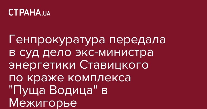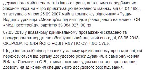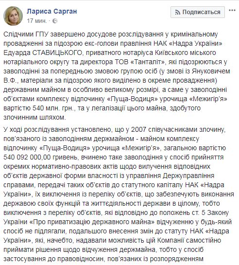 "Следователями ГПУ завершено досудебное расследование в уголовном производстве по подозрению экс-председателя правления НАК "Надра Украины" Эдуарда Ставицкого, а также частного нотариуса Киевского городского нотариального округа и директора ООО "Танталит", которые подозреваются в завладении по предварительному сговору группой лиц (в сговоре с Виктором Януковичем), государственным имуществом в особо крупном размере, а именно в завладении объектами комплекса отдыха "Пуща Водица" урочища "Межигорье" стоимостью 540 млн. грн., и в легализации имущества, добытого преступным путем", - сказано в сообщении.
