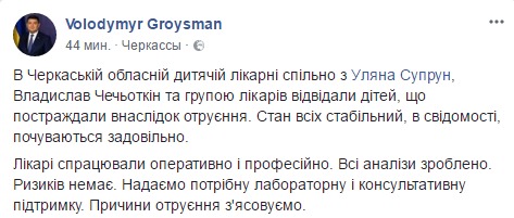 "Состояние всех стабильное, в сознании, чувствуют себя удовлетворительно. Врачи сработали оперативно и профессионально. Все анализы сделаны. Рисков нет. Оказываем необходимую лабораторную и консультативную поддержку. Причины отравления выясняем. На данный момент загрязнений не выявлено, в воздухе загрязнений не выявлено. Это говорит о том, что то вещество, которое было применено, не находится ни в воздухе, ни на грунте, ни в воде. Далее более детальные исследования будут делать в лабораториях. Если оно еще есть, это вещество, то оно будет выявлено", - отметил Гройсман.