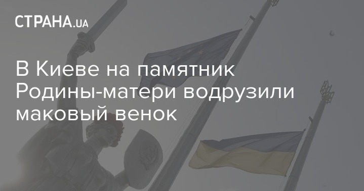 На памятнике Родины-матери в Киеве закрепили венок из маков. Из-за грозы и шквального ветра венок устанавливали двое суток.