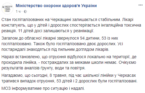 Напомним, что 8 мая во время линейки в черкасской школе № 8 дети начали терять сознание. Сначала управление ГосЧС известили о госпитализации трех детей, потом на головокружение и тошноту пожаловались другие.