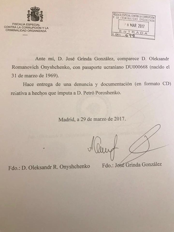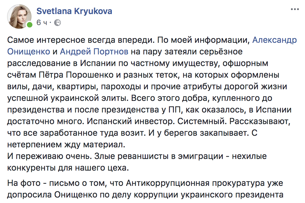 Ранее заместитель главного редактора "Страны" Светлана Крюкова написала у себя в ФБ, что Александр Онищенко и Андрей Портнов "затеяли серьезное расследование в Испании по частному имуществу, офшорным счетам Петра Порошенко и разных теток, на которых оформлены виллы, дачи, квартиры, пароходы и прочие атрибуты дорогой жизни успешной украинской элиты. Всего этого добра, купленного до президентства и после президентства у ПП, как оказалось, в Испании достаточно много. Испанский инвестор. Системный. Рассказывают, что все заработанное туда возит. И у берегов закапывает. С нетерпением жду материал. И переживаю очень. Злые реваншисты в эмиграции – нехилые конкуренты для нашего цеха".