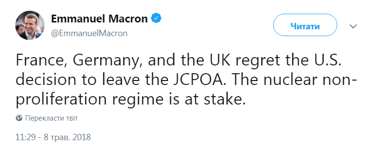 "Франция, Великобритания и Германия сожалеют о том, что Трамп отказался от ядерной сделки Ирана. На кону - (весь, как таковой - Прим.Ред.) режим нераспространения ядерного оружия", - прокомментировал произошедшее президент Франции Эммануэль Макрон.
