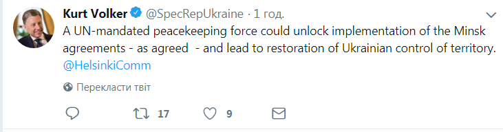 "Миротворческие силы ООН могут разблокировать выполнение Минских соглашений и привести к восстановлению контроля Украины над территорией", - написал он в Twitter.