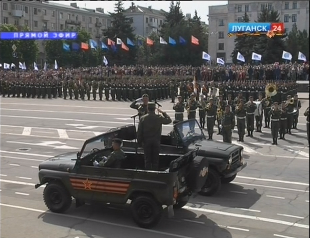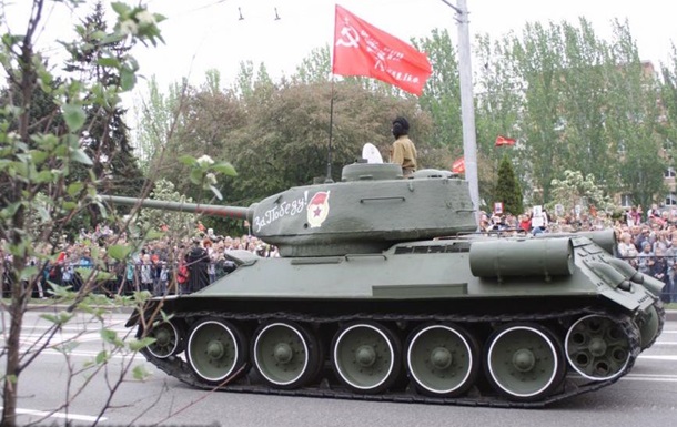 Также парад проводят и в Луганске. Открыл его глава "ЛНР" Леонид Пасечник. Руководитель МВД "республики" Игорь Корнет нарядился в форму генералиссимуса. Парад военной техники и вооружения возглавляет танк Т-34, восстановленный после повреждений, полученных при артиллерийском обстреле.