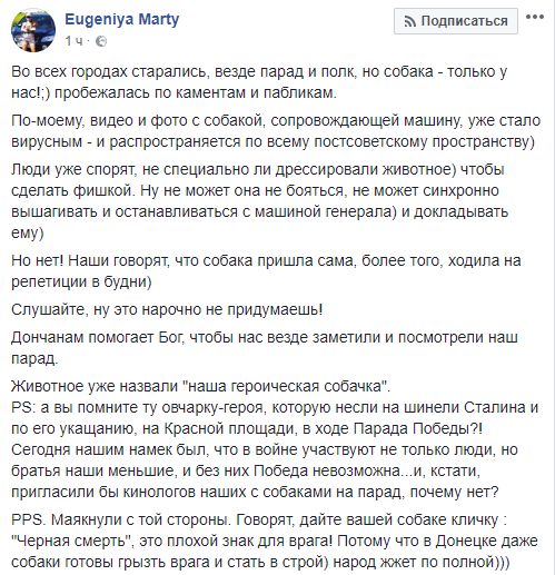 Блогер Евгения Мартынова пишет о собаке, которая преследовала машины на параде в Донецке: "Во всех городах старались, везде парад и полк, но собака - только у нас!;) пробежалась по каментам и пабликам. По-моему, видео и фото с собакой, сопровождающей машину, уже стало вирусным - и распространяется по всему постсоветскому пространству)
