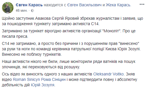"С14 не задержан, а просто без причины и с нарушением прав "вынесен" за руки и ноги по команде руководителя патрульной полиции Киева Юрия Зозули. Вынесен не вблизи турникетов. Наши активисты никого не били, только мониторили ряды ватников на поиск преступников, скрывающихся от розыска", - написал Карась и добавил видео.