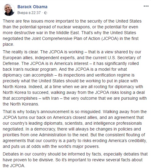 Бывший президент США Барак Обама, во времена которого был подписан Совместный всеобъемлющий план действий (JCPOA, Иранское ядерное соглашение), заявил, что решение президента Трампа выйти из соглашения подтолкнет к началу новой войны в нестабильном регионе. Об этом он написал на официальной странице в Facebook.