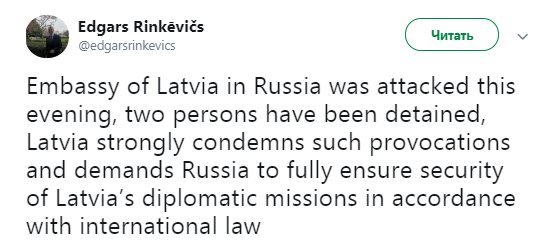 "Латвия решительно осуждает такие провокации и требует от России полностью обеспечить безопасность латышской дипломатической миссии в соответствии с международным правом", - говорится в сообщении министра.