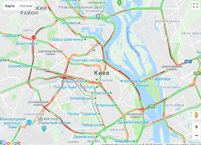 Кроме того, в Днепровском районе около станций метро "Черниговская", "Дарница" и "Лесная" движение затруднено, однако движутся авто чуть быстрее - 15 км/ч.