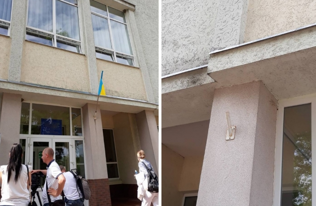 Однако утром 11 мая, за несколько часов до визита Владимира Гройсмана венгерский флаг исчез с фасада. Там остался только украинский.