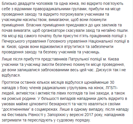 Около двадцати мужчин и одна женщина, которые открыто связывают себя с известными праворадикальными группами, прибыли на место проведения мероприятия и открыто угрожали участникам и участницам насилием, требуя, чтобы они покинули помещение. Владелец помещения присоединился к этим призывам и потребовал, чтобы организаторы отменили мероприятие и немедленно ушли. На месте изначально присутствовали пять сотрудников полиции из Печерского управления Главного управления Национальной полиции в г. Киеве, однако они отказались вмешаться и обеспечить проведение мероприятия и безопасность участников и участниц.