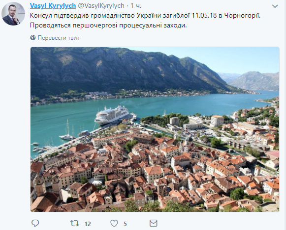 "Консул подтвердил гражданство Украины погибшей 11 мая в Черногории. Проводятся первоочередные процессуальные мероприятия", - написал он в микроблоге в Twitter в субботу.