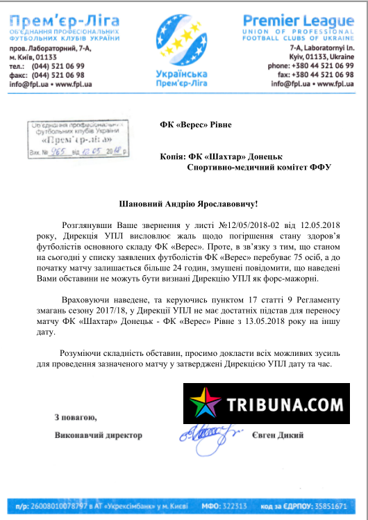 "У дирекции УПЛ нет достаточных оснований для переноса матча ФК "Шахтер" Донецк - ФК "Верес" Ровно с 13.05.2018 года на другую дату. Понимая сложность обстоятельств, просим принять все возможные меры для проведения указанного матча в утвержденные дирекцией УПЛ дату и время", - отмечается в сообщении на сайте лиги.