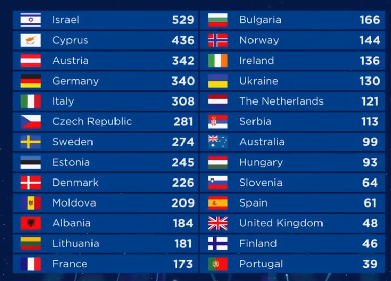 После голосования профессионального жюри израильская певица занимала в общем зачете место, но зрители отдали ей максимальное количество баллов, за счёт чего она и выиграла, опередив других участников, включая Австрию, лидировавшую после голосования жюри.