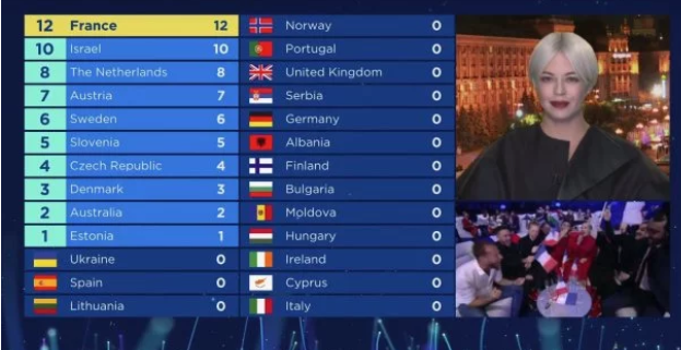 Как проголосовало украинское жюри на Евровидении 2018: Франция – 12, Израиль – 10, Нидерланды – 8, Австрия – 7, Швеция – 6, Словения – 5, Чехия – 4, Дания – 3, Австралия – 2, Эстония – 1.