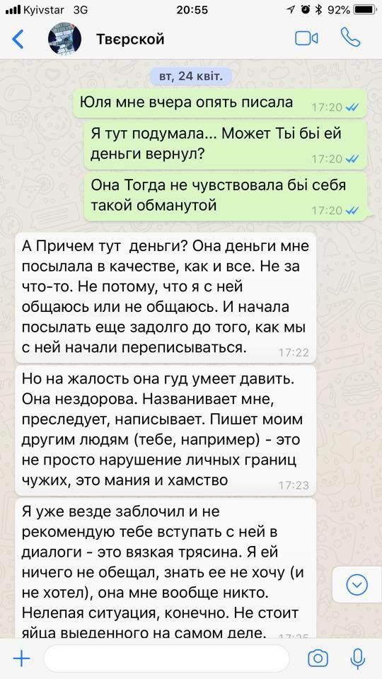 Также она опубликовала на своей странице в Facebook скрины личных переписок Ольги Миколюк с Тверским и выписки с его банковской карты.